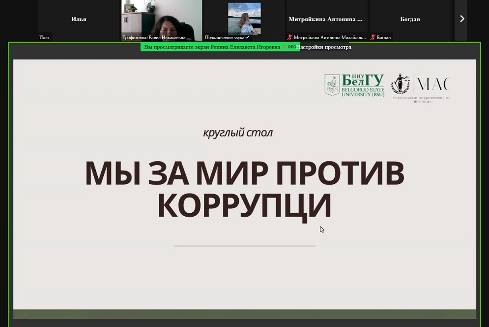В Белгородском госуниверситете формируют нетерпимое отношение к коррупцииКруглый стол «Мы за мир против коррупции» с участием студенческого актива институтов и факультетов НИУ «БелГУ», представителей Союза Студентов и молодёжного антикоррупционного совета состоялся в онлайн-формате. | |