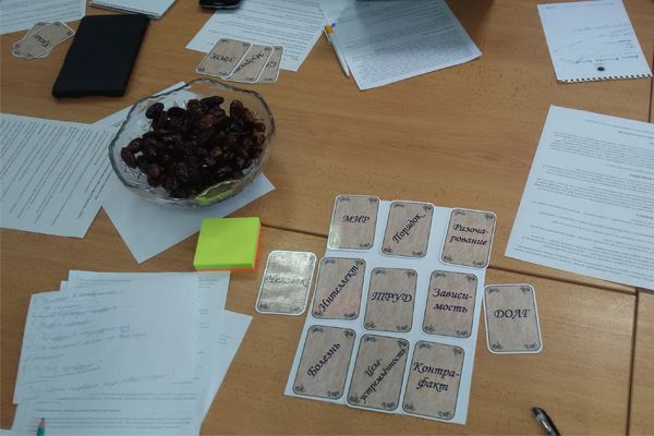 На этот вопрос пытались ответить, используя карты с зафиксированными на них категориями и понятиями: «свобода», «радость», «труд», «альтернатива», «человек», «зависимость» и др. Выбрав одну из карт, участник с её помощью строил аргументацию-ответ. Экспертная оценка и голосование игроков определяли наиболее последовательную и убедительную аргументацию.