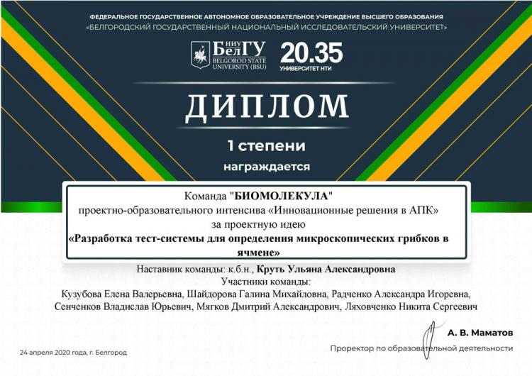 - I место – команда «БИМОЛЕКУЛА» с проектом «Разработка тест-системы для определения микроскопических грибков в ячмене», наставник Ульяна Круть;