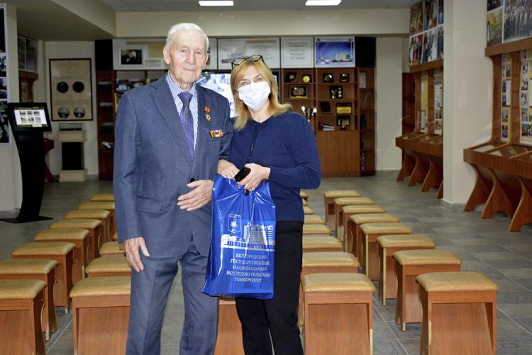 В связи с распространением новой коронавирусной инфекции добровольцы с соблюдением всех мер предосторожности поздравили пожилых людей дома. Почётного профессора НИУ «БелГУ», бывшего ректора Пётра Григорьевича Коняева, который и по сей день принимает активное участие в жизни университета, в стенах Alma mater поздравила и вручила ему подарок директор департамента воспитательной деятельности Маргарита Варфоломеева.