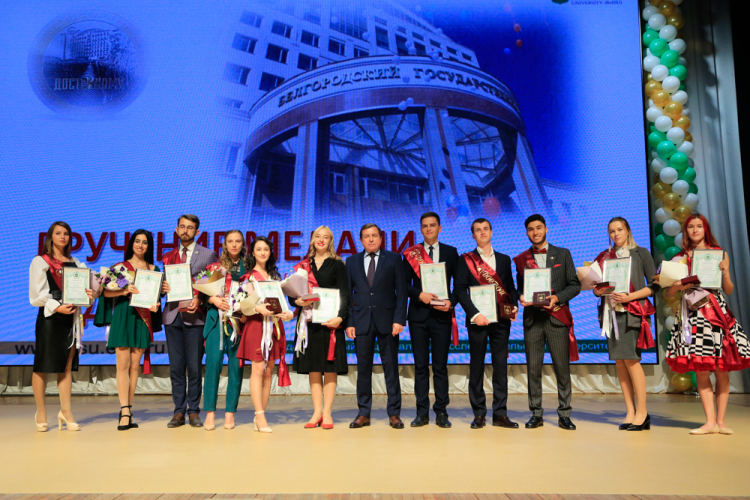 В год своего 140-летия Белгородский госуниверситет возродил традицию, восходящую к 19 веку, – награждать выпускников 2021 года, достигших успехов в учебной, научной, общественной деятельности, в творчестве и спорте медалью «Достойному». Ректор вручил награду – Екатерине Бражник, Ани Галшоян, Глебу Кривошееву, Елене Кузубовой, Марине Лаврук, Диларе Мамедовой, Сергею Медведеву, Павлу Серикову, Алиёру Тожибаеву, Анастасии Шайдуровой и Алисе Чаплыгиной.
