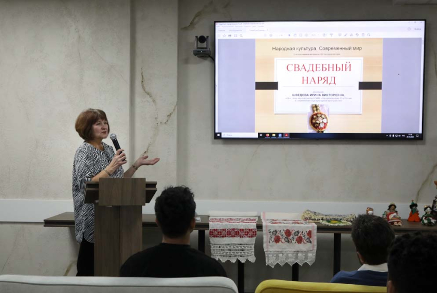 В роли приглашённого эксперта на мероприятии выступила Ирина Шведова, выпускница НИУ «БелГУ», кандидат философских наук, представитель научной школы «Народная музыка Юга России в современном социокультурном пространстве». Она глубоко занимается исследованиями символики народного костюма, этнокультурной идентичности, культурных универсалий в социокультурном пространстве. Ирина Викторовна рассказала, какие костюмные комплексы были распространены на Белгородчине в прошлом, чем отличался костюм невесты от обыденной одежды, какие цвета и почему использовались в свадебных нарядах на Руси.