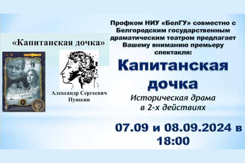 Профком НИУ «БелГУ» совместно с Белгородским государственным академическим драматическим театром имени М.С. Щепкина приглашает посетить премьерный спектакль «Капитанская дочка».